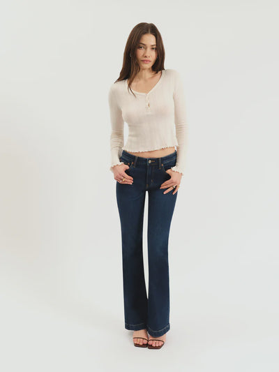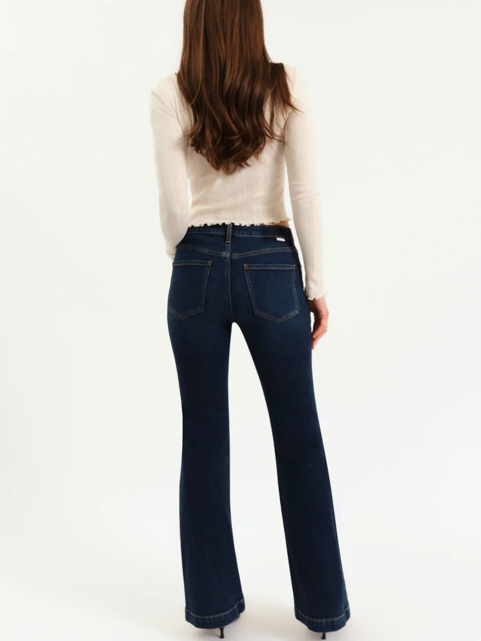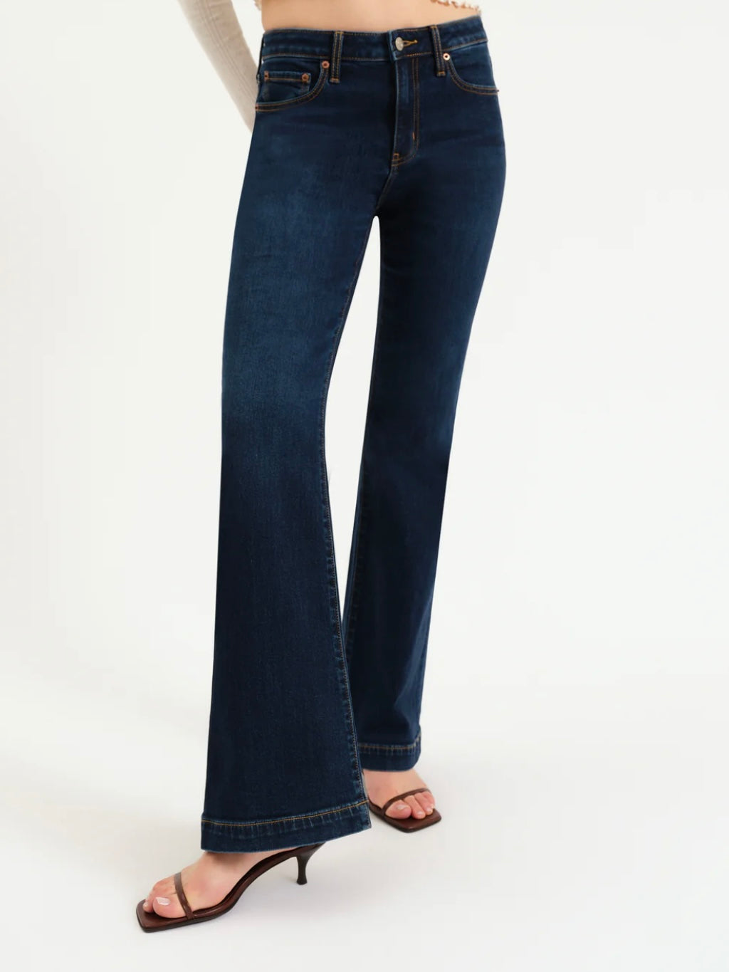 The Heartbreaker is a mid-rise flare in a classic indigo dark wash. This flattering silhouette will take you from daytime to date night with ease.o