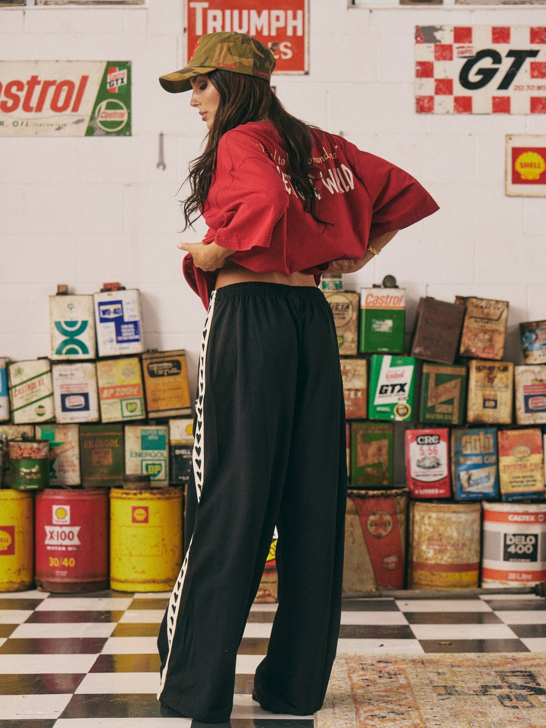Oversized Fit. Featuring an extra wide relaxed leg, woven heart tape down the side of the legs, side pockets, a cute Sabbi leg embroidery and thick elasticated waistband with draw string.