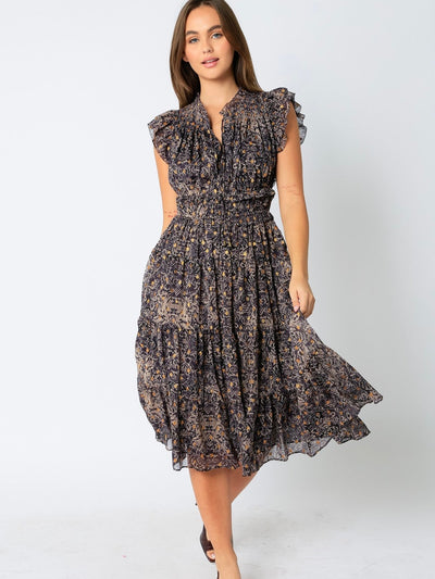 Olivaceous Gold Geo Ruffled Midi Dress Dark Navy