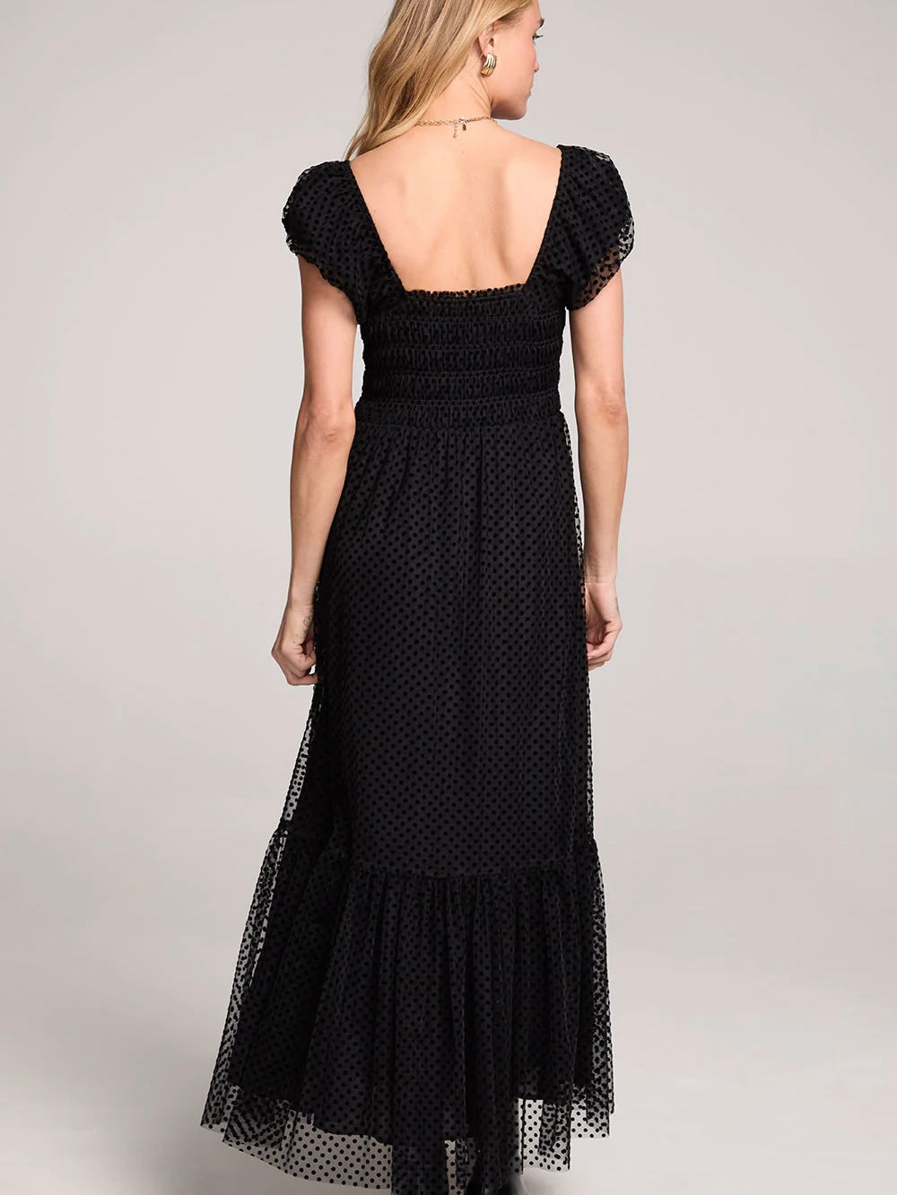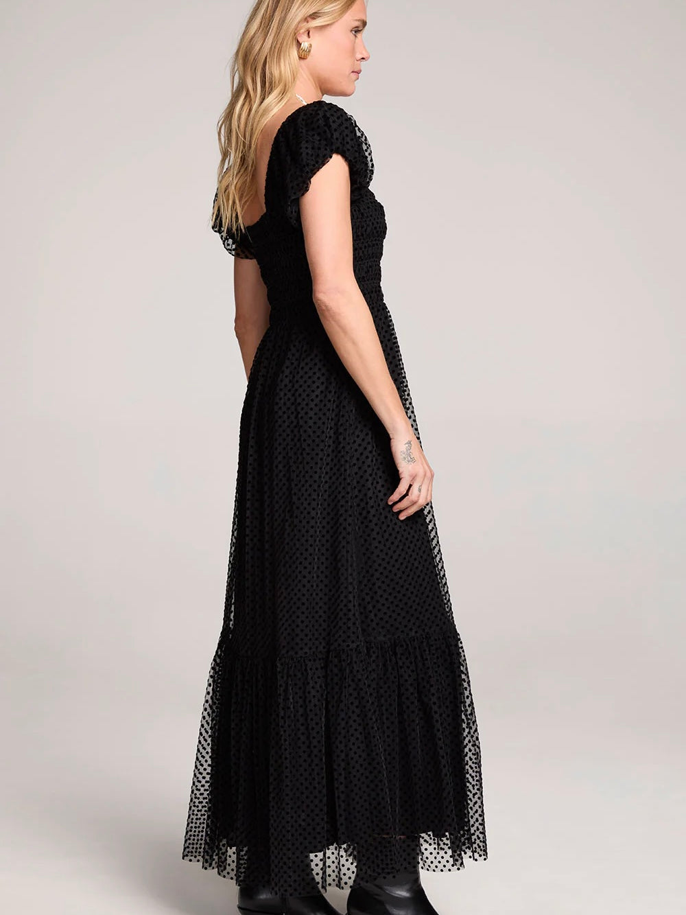 The Yarah Maxi Dress offers an elevated take on the classic black maxi with a striking geometric neckline and a structured bodice.