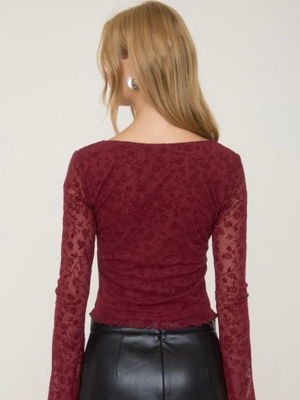 Velvet Floral Print Long Sheer Sleeve Knit Top Burgundy