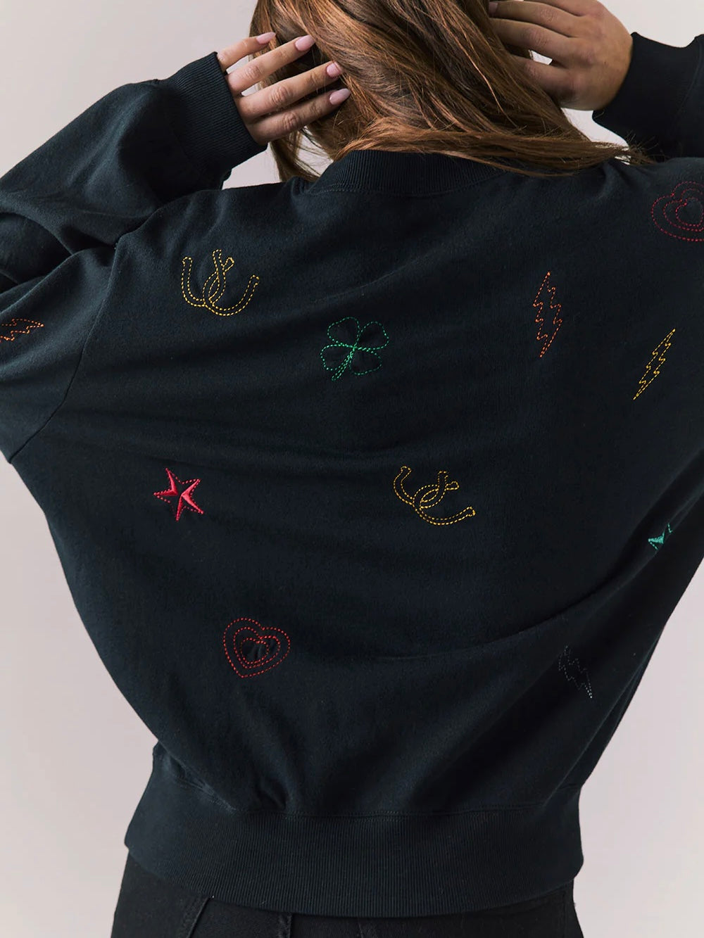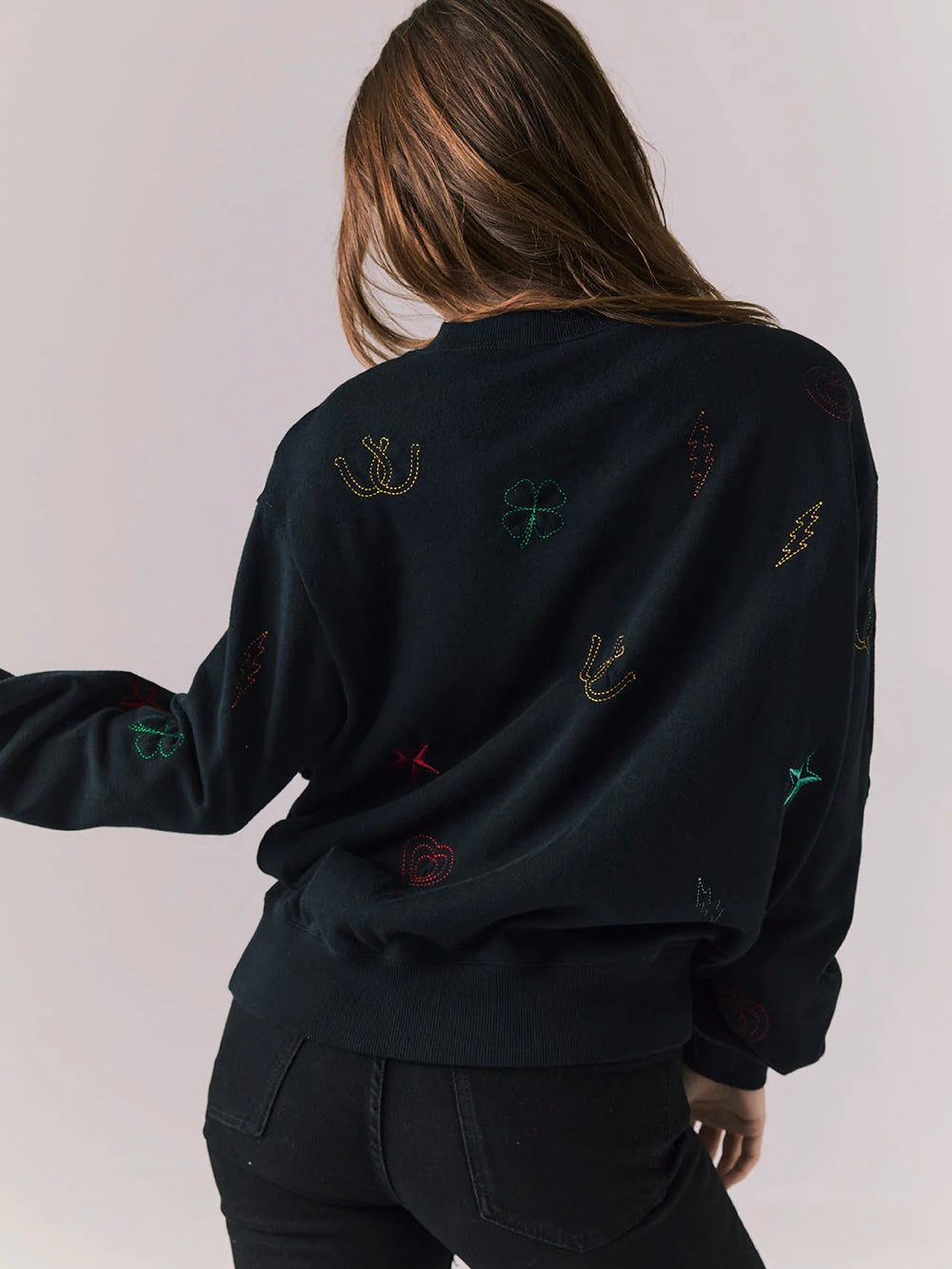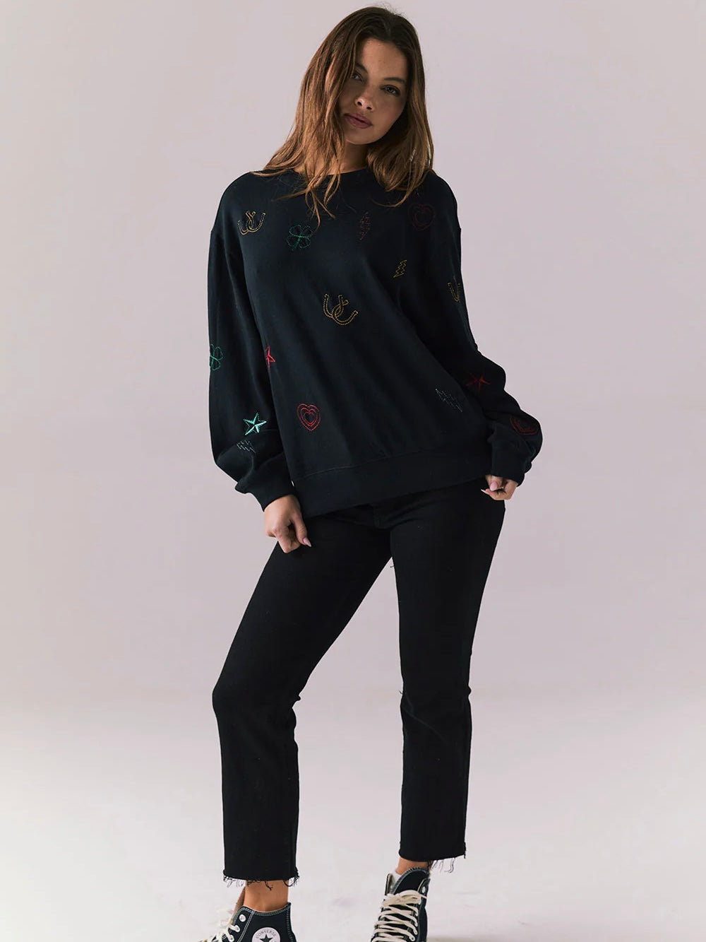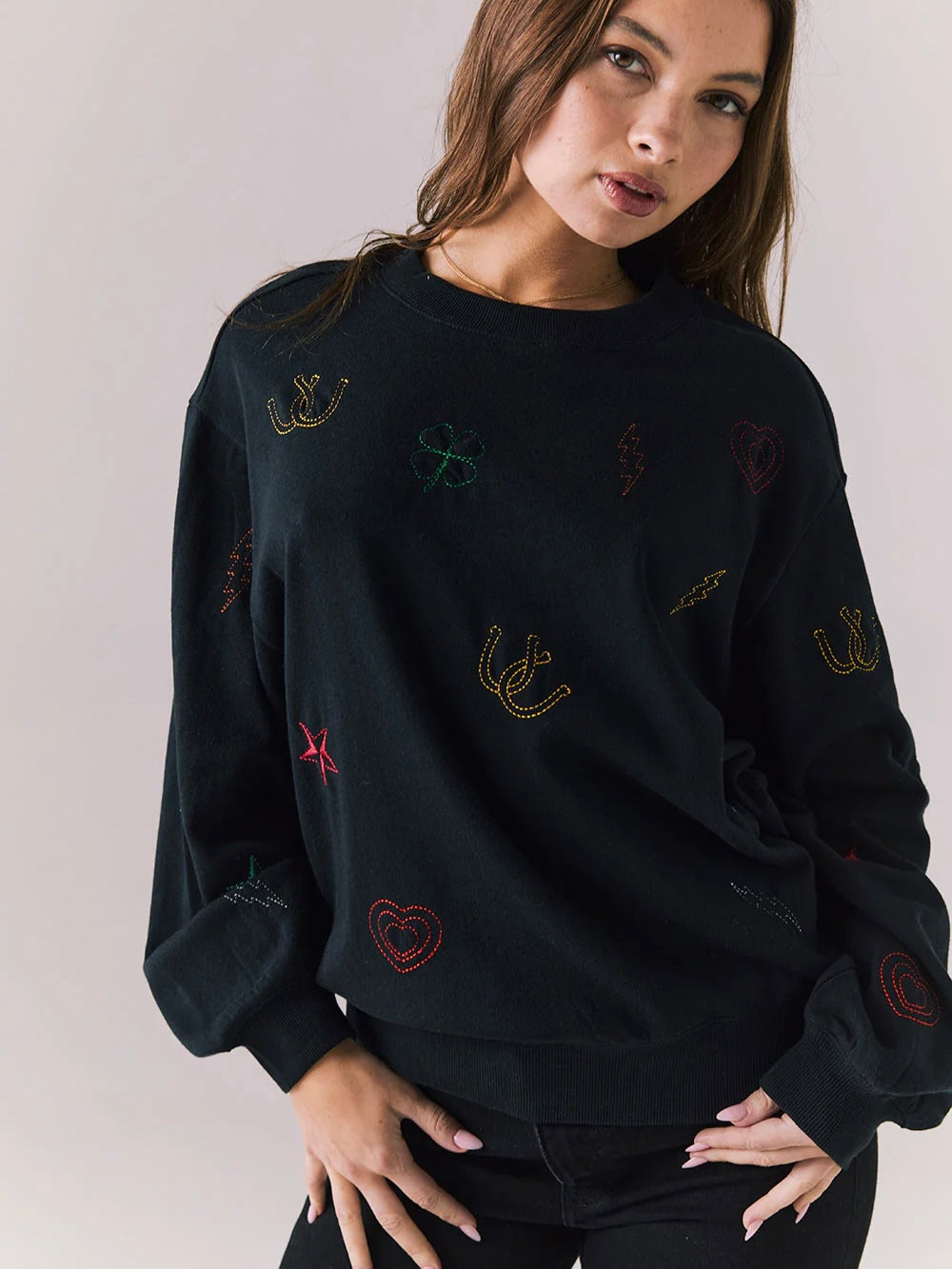 This black long sleeve channels bold graphic energy with front-to-cuff icon prints.