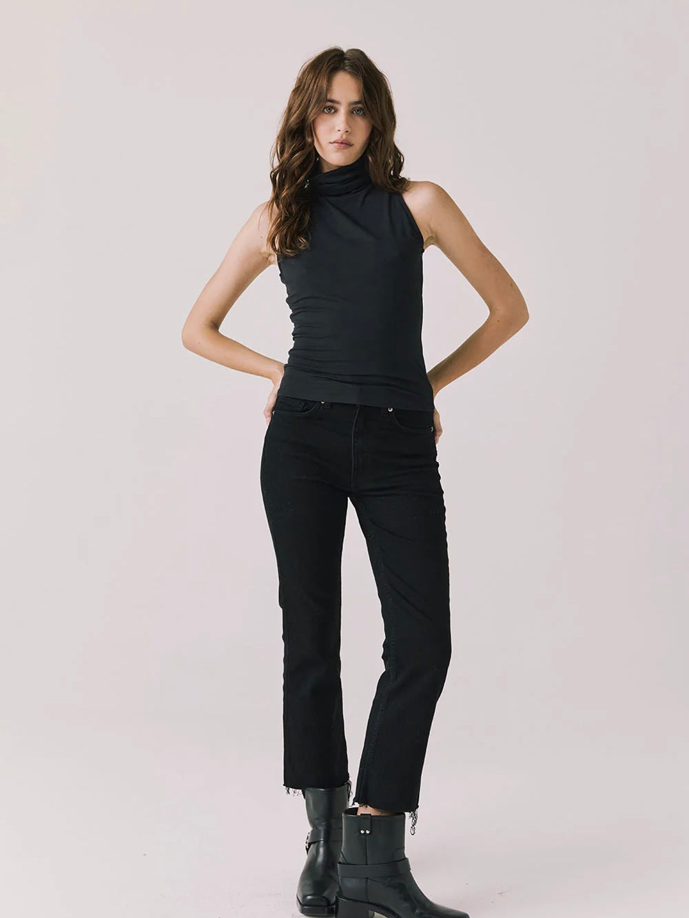 Elevate your wardrobe with the Hailee Black Tank, featuring a high turtleneck and a sleek, fitted silhouette.