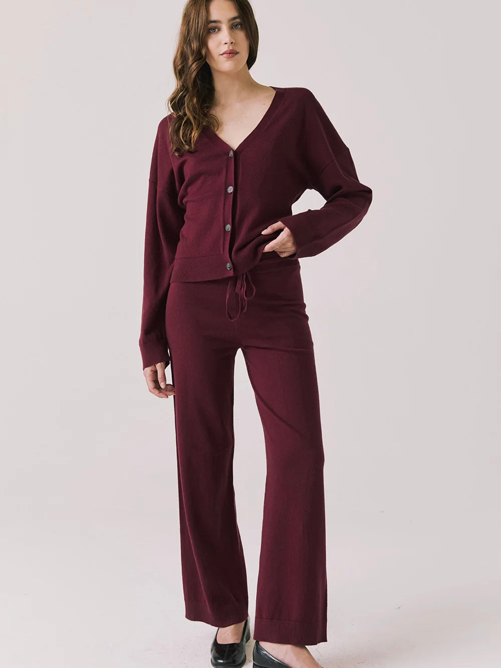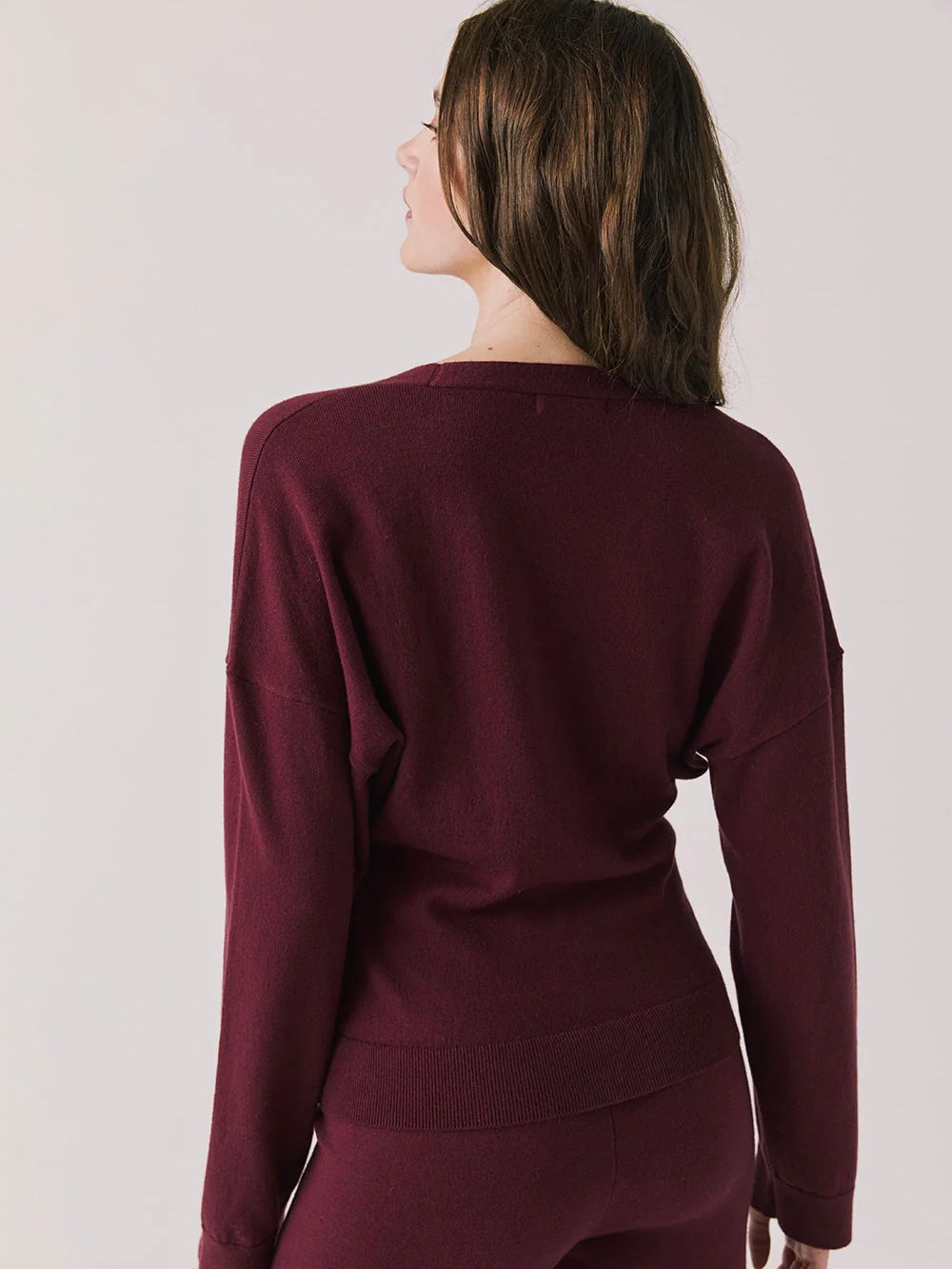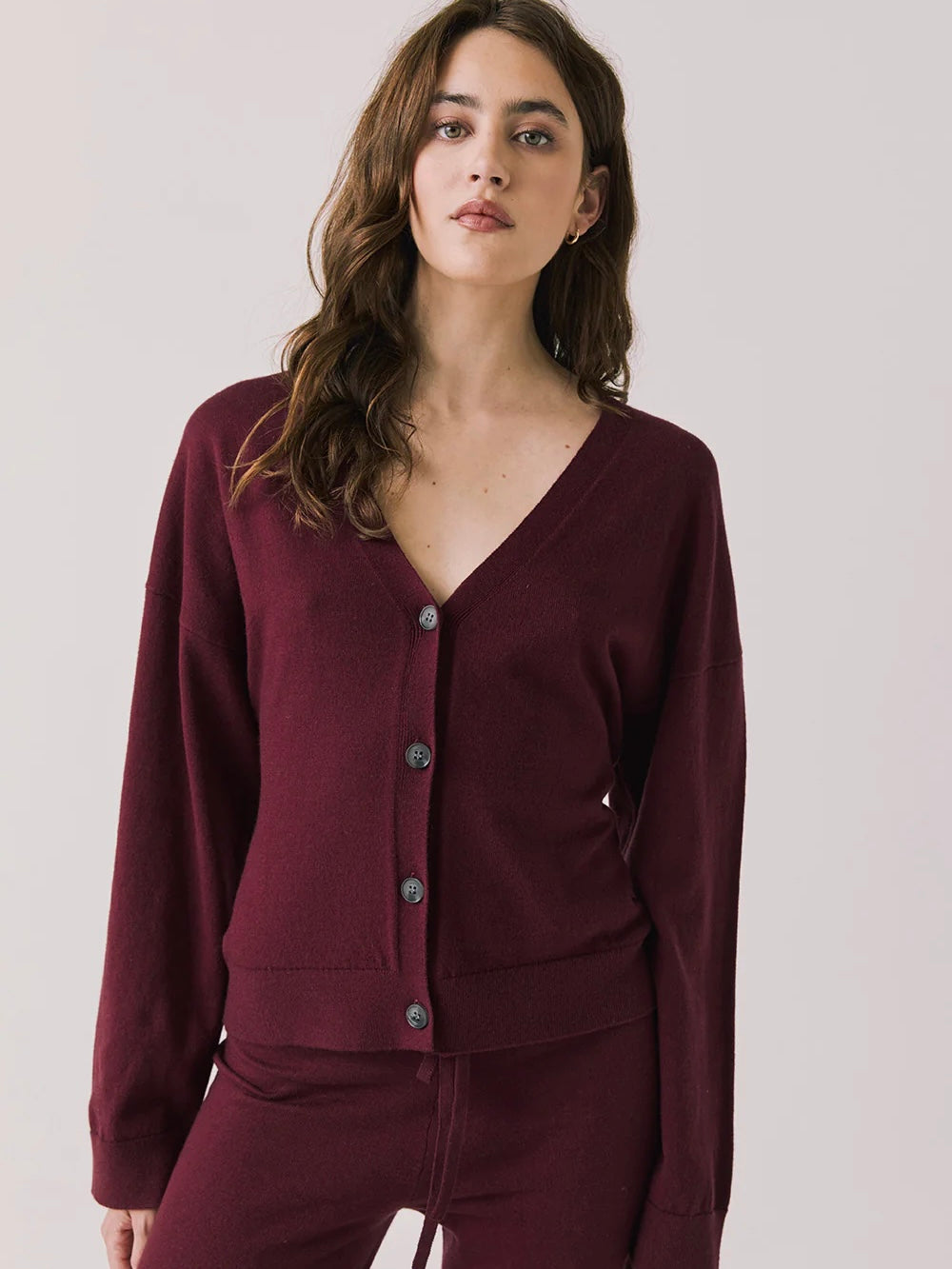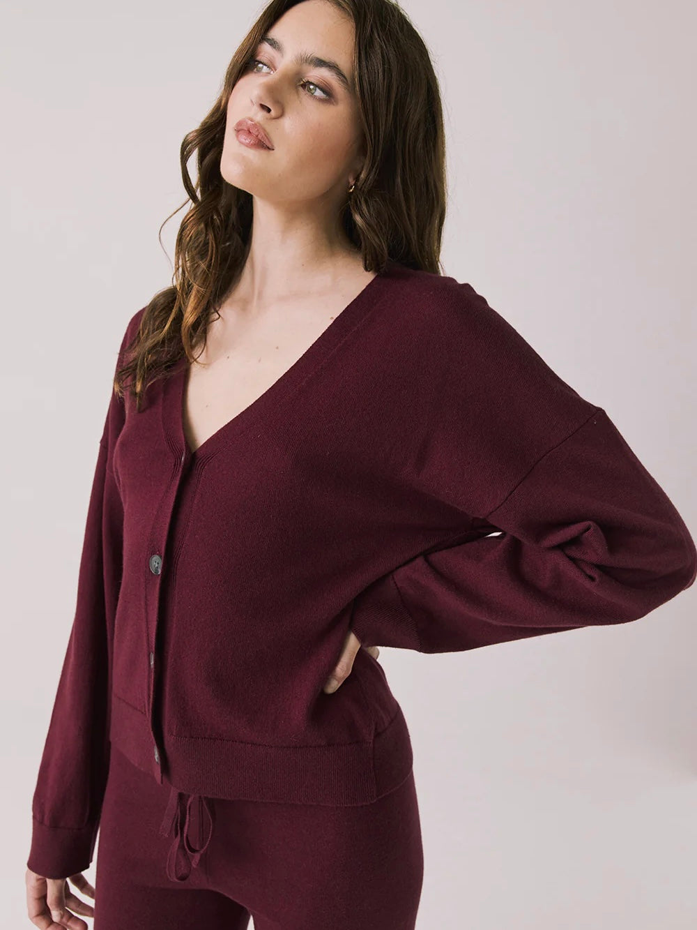 Elevate your loungewear with the Maison Purple Fig Cardigan Sweater, featuring a slouchy fit and effortless button-down design.