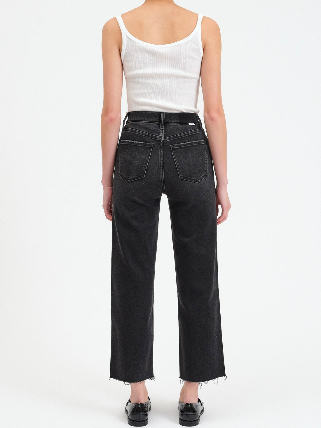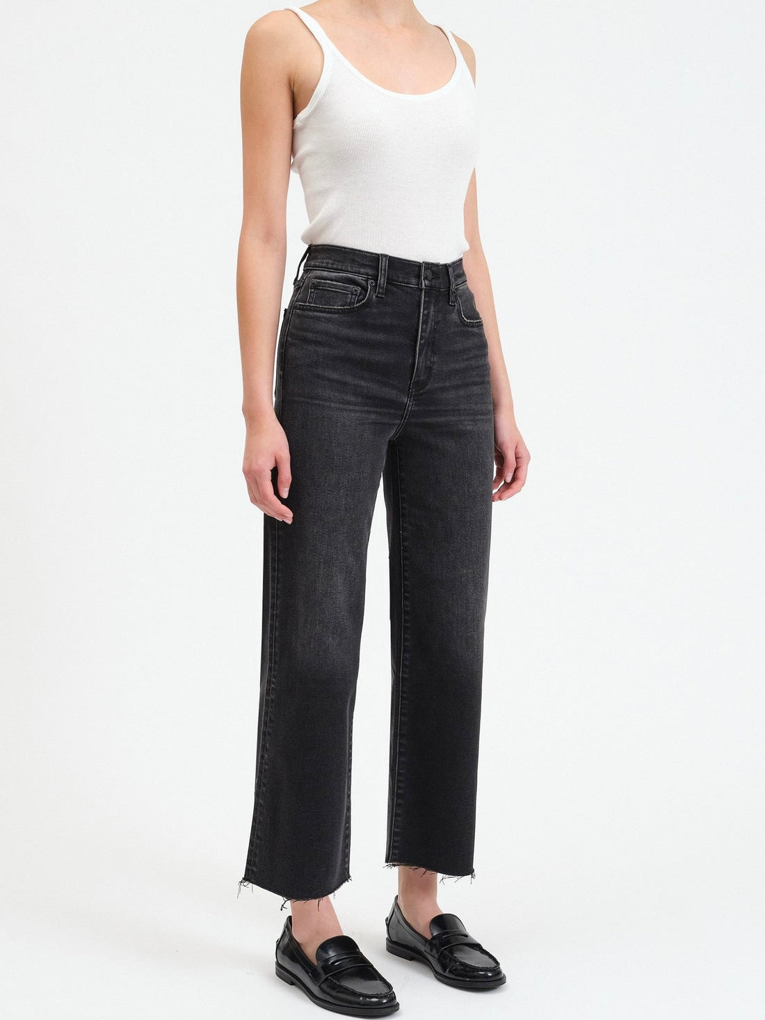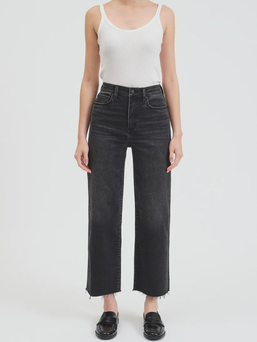 In an easy wide leg, this waist defining high rise features a slightly faded black wash with a scissor cut hemline. Constructed in our "Repreve" denim, it is a super stretch fabric created from recycled plastic.