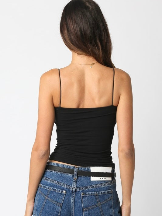 Our Emmy Tank Top features spaghetti straps and a soft ribbed fabric with a body-hugging fit with square neck.