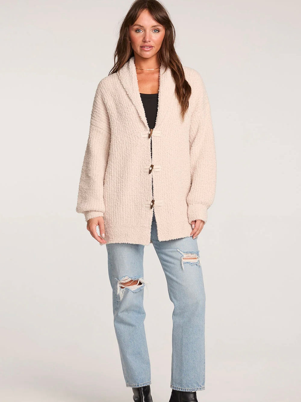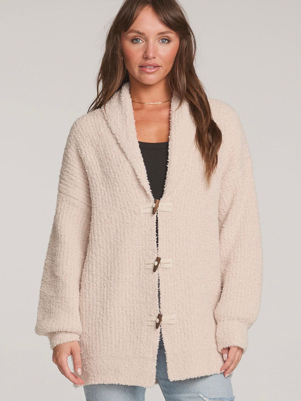 The Safire Natural Sweater draws inspiration from classic fisherman styles with its chunky knit and toggle closures.