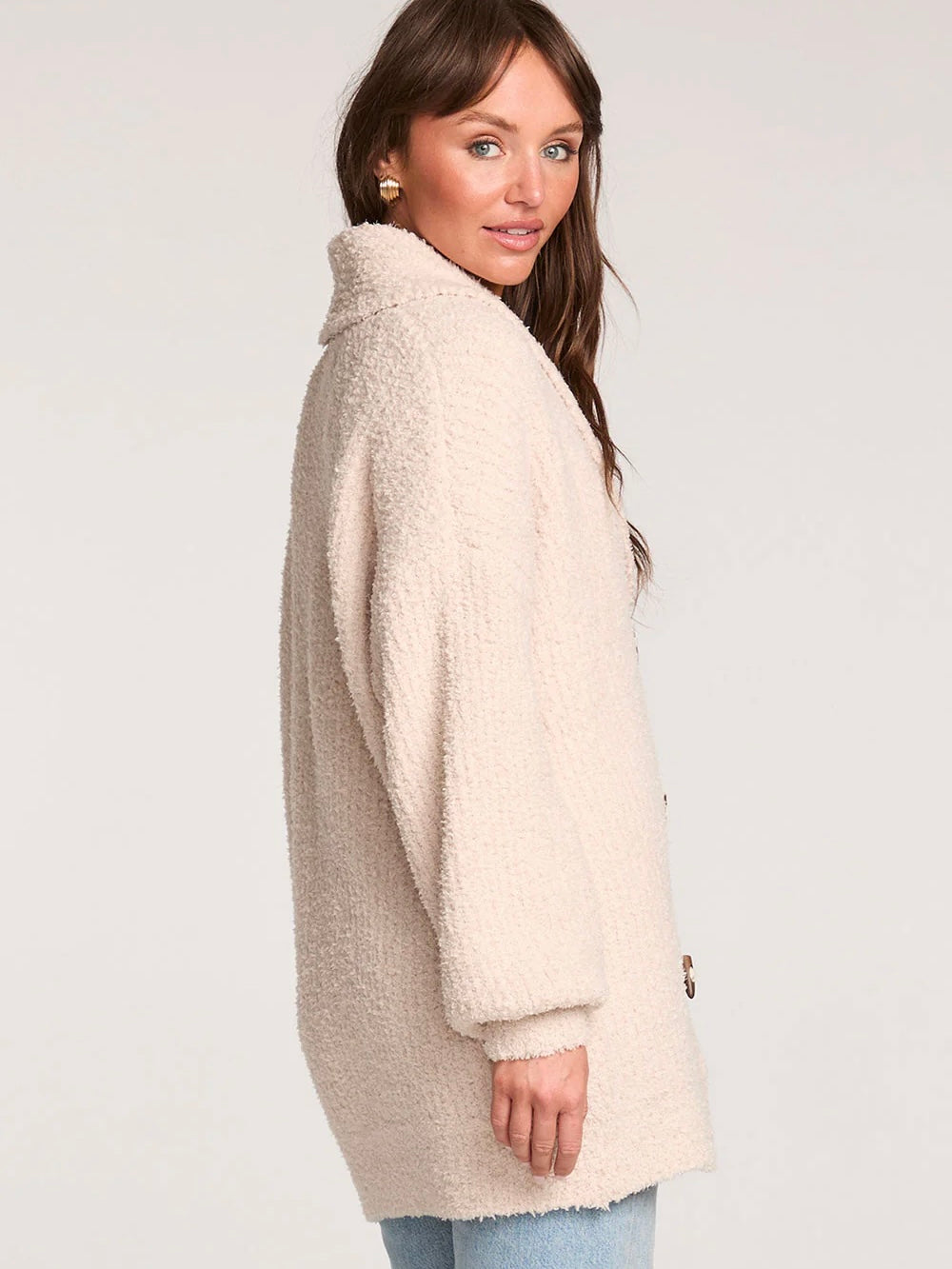 Featuring a roomy body and generous sleeves with gathered cuffs, this cozy piece invites you to snuggle up in timeless sophistication.