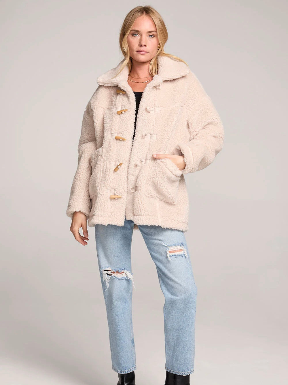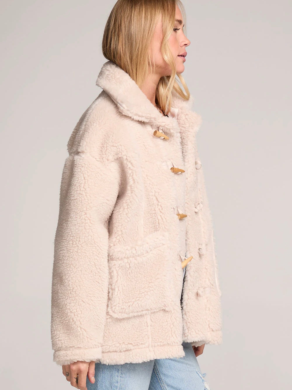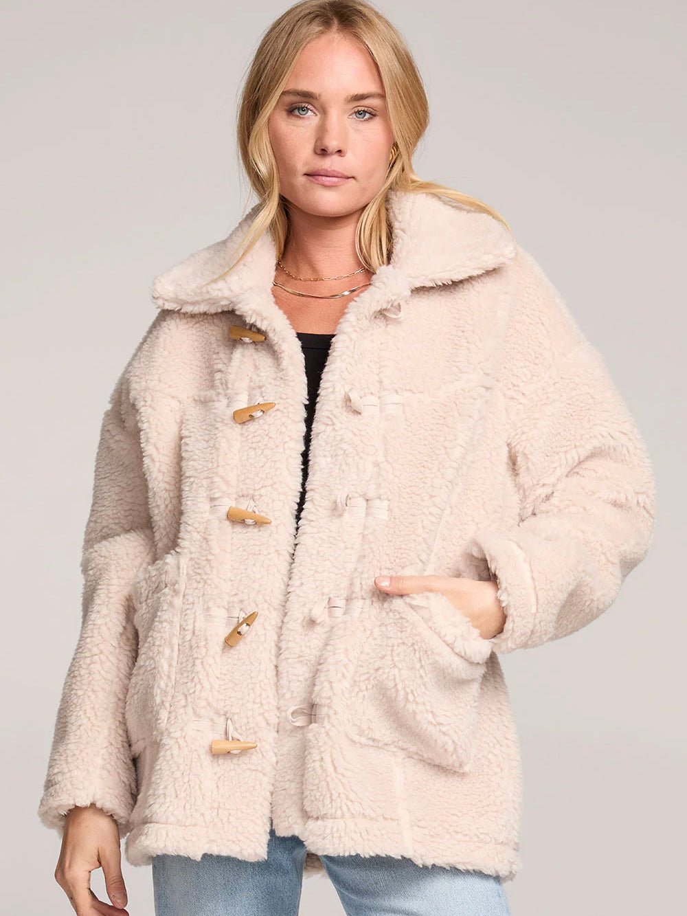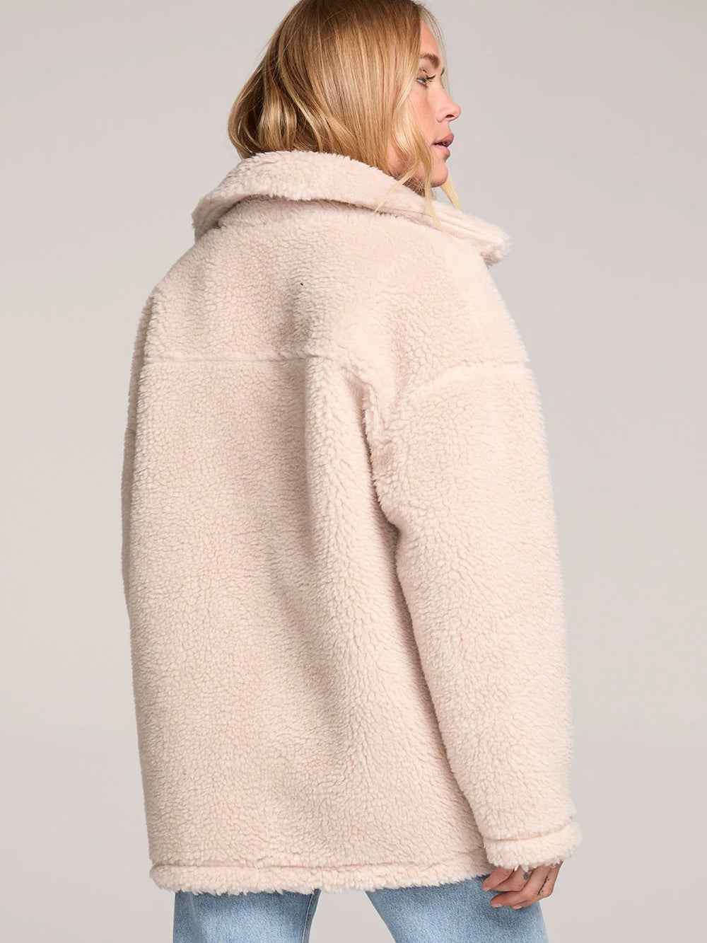 The Finnley Jacket channels 70s glam with its cozy fleece fabric and wide lapels.