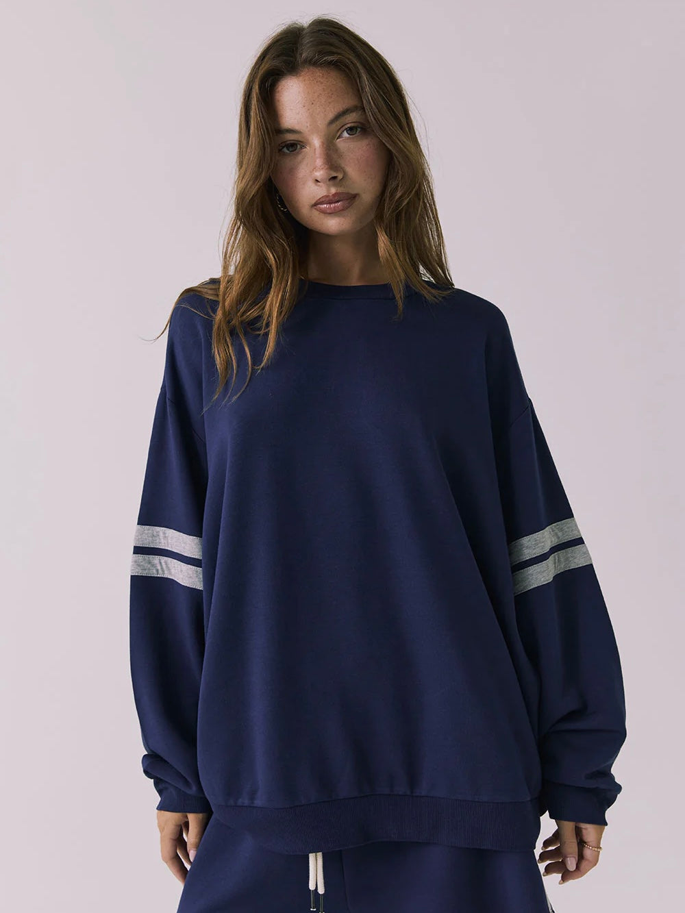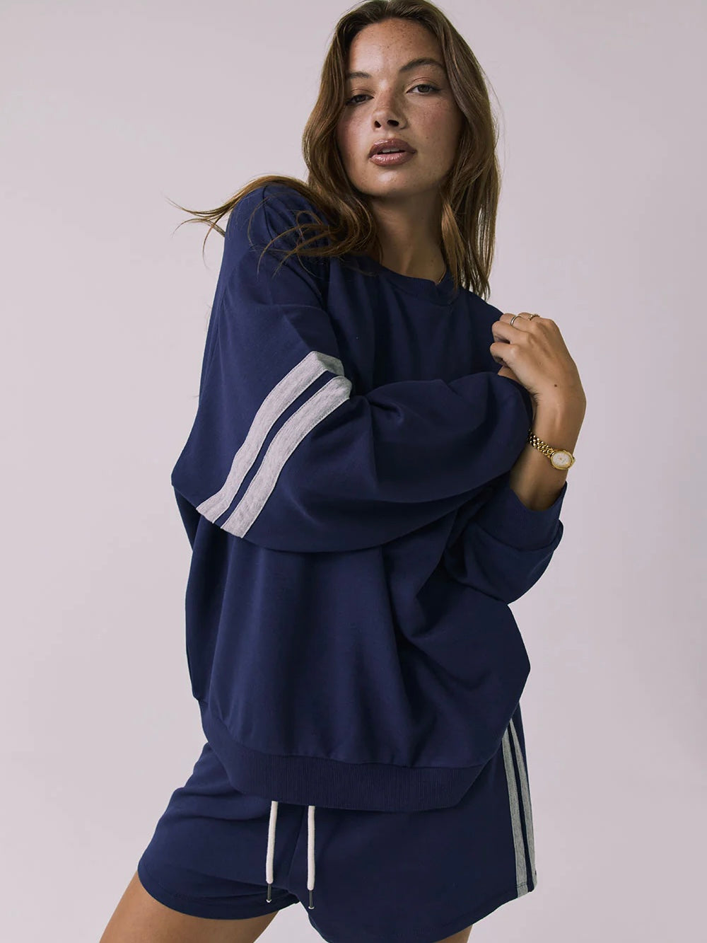 Crafted in a striking sapphire base, this pullover features soft heather stripe accents along the sleeves. Wear with our matching Sandi Joggers or Hanoverr Shorts for the perfect set.