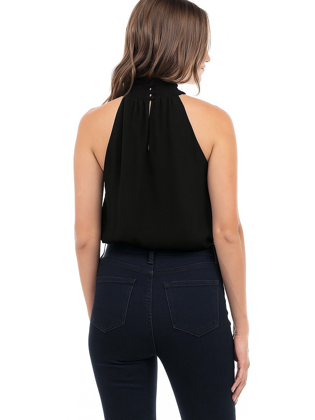 Halter Mock Neck Smocked Rounded Hem Top Women's Halter Mock Neck Smocked Rounded Hem Top Lightweight woven fabric with a sleek halter mock neckline for a polished look. Smocked details and rounded hem create texture and a flattering finish. Fabric: Woven 100% POLYESTER Hand Wash Cold
