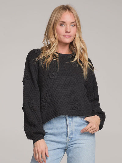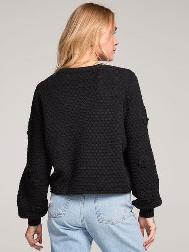 The Aven Sweater is a classic black pullover featuring a high neckline and stylish gigot sleeves.